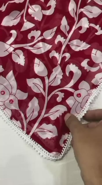 Add elegance to your ethnic collection with this stunning Georgette Kalamkari Allover Saree, crafted for comfort and style. Made from soft georgette fabric, it drapes beautifully and feels light on the skin. The saree showcases vibrant red Kalamkari prints throughout, paired with a white cotton lace border accented by Aari mirror work, giving it a handcrafted designer appeal. The set includes a contrast Manipuri georgette blouse piece with red piping and Aari mirror detailing, completing the look with sophistication.