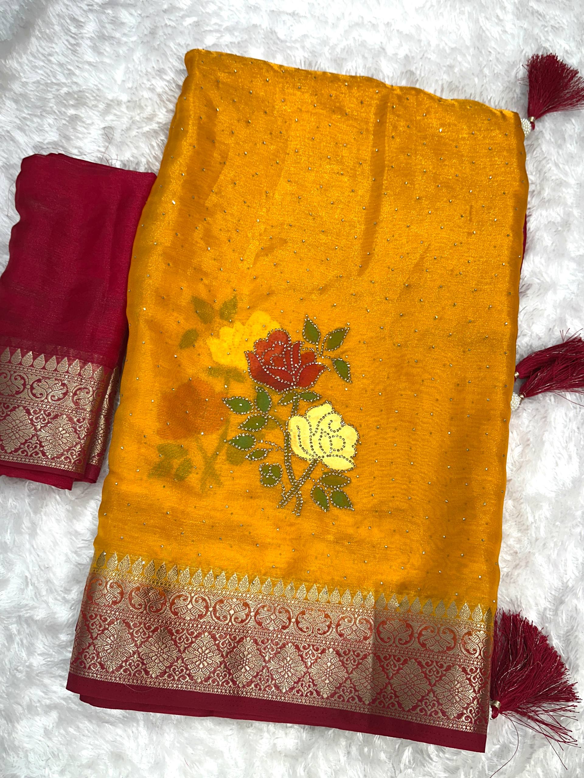 Elegant Brush Print & Zari Zarkhan Diamond Work Pure Fandy Satin Saree With Blouse
