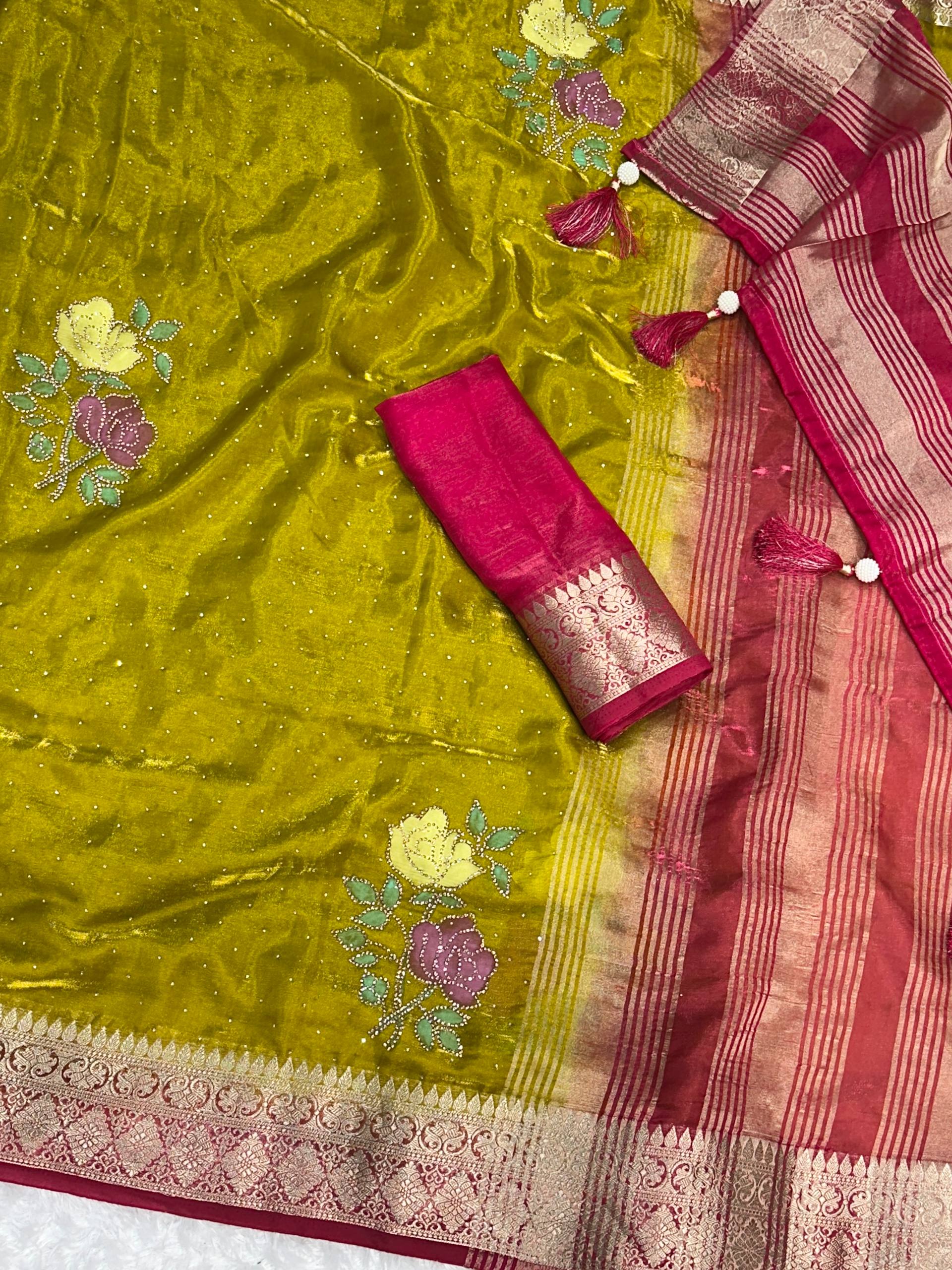 Blouse: Includes a running blouse piece in a contrasting color, crafted from the same zari-woven Fandy satin.