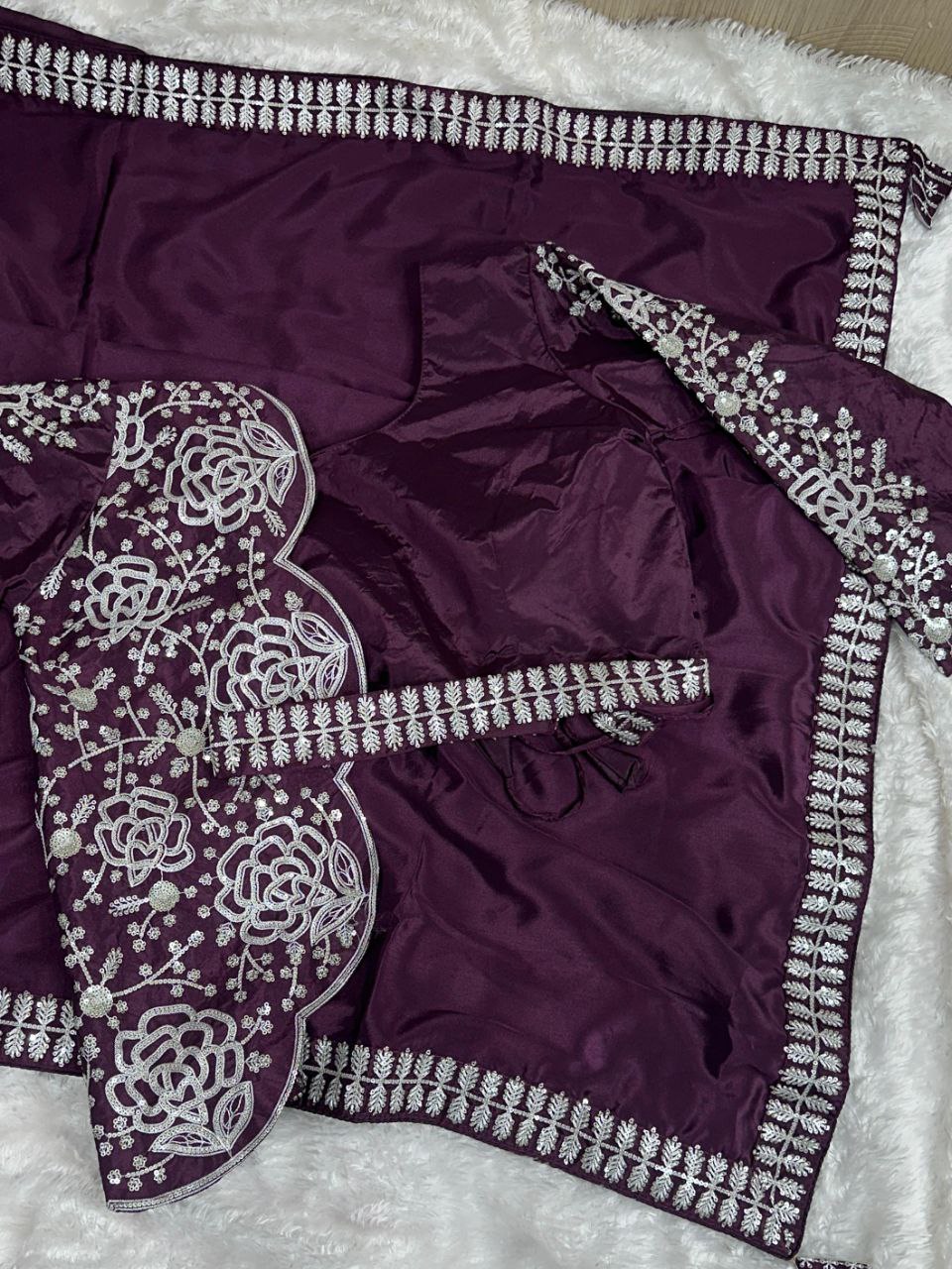 Be the star of every celebration in this breathtaking partywear ensemble. This exquisite silk crepe saree and matching stitched koti (jacket) blouse set is designed to make you shine. Featuring luxurious embroidery and a modern silhouette, it's a flawless blend of traditional elegance and contemporary style, making it a must-have statement piece for your wardrobe.