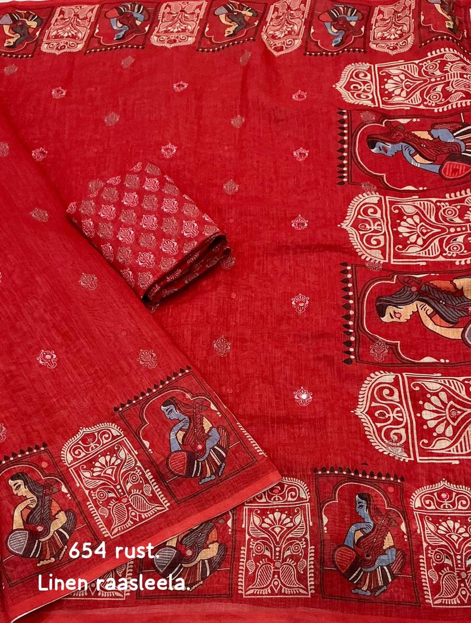 Fancy Rust Red Soft Linen Aari Mirror Work Kalamkari Printed Saree with Blouse