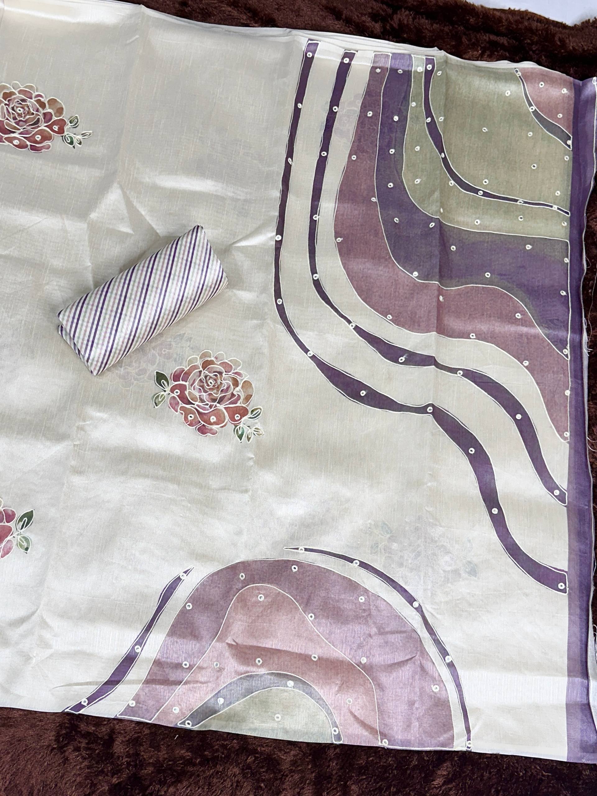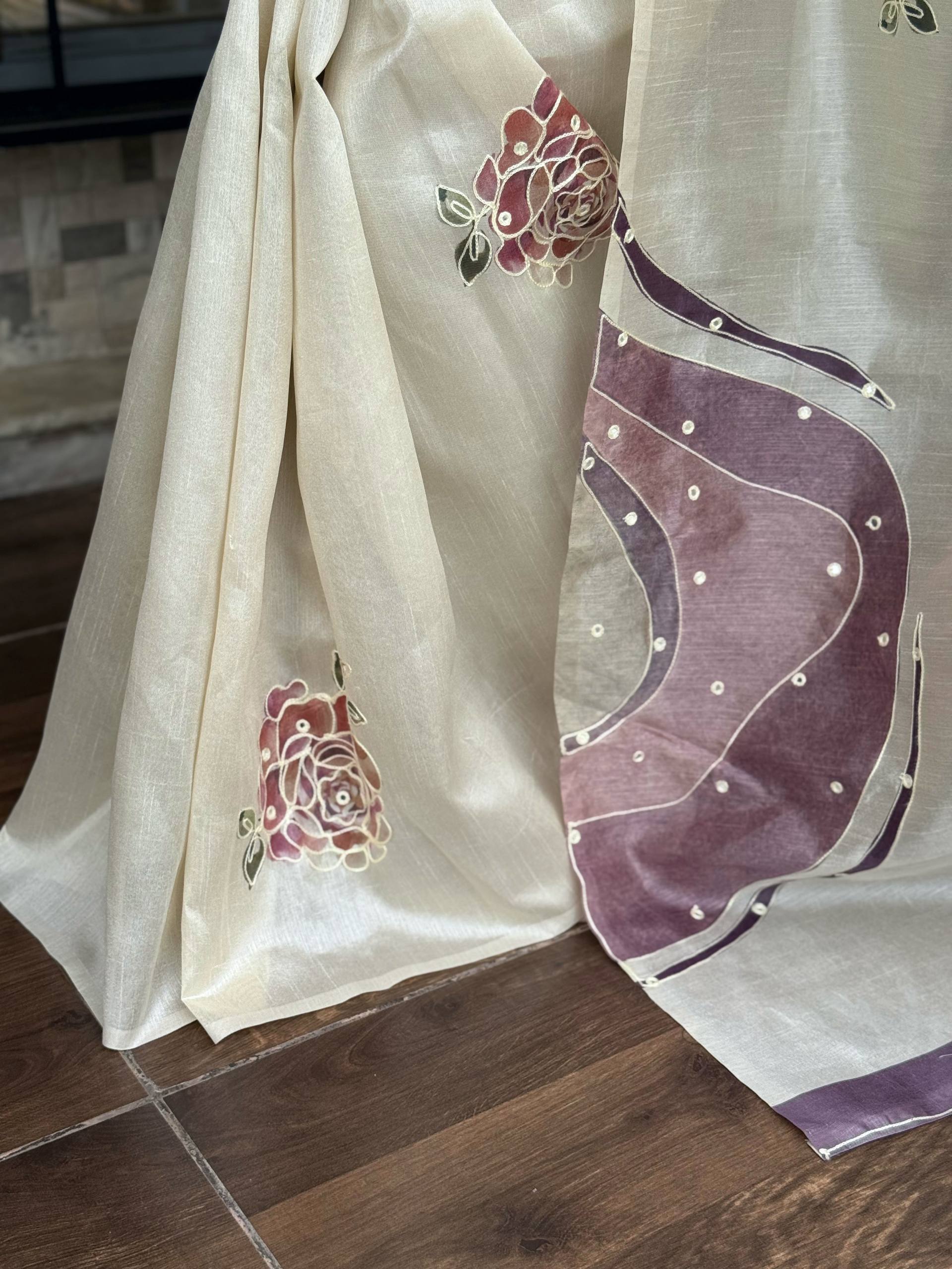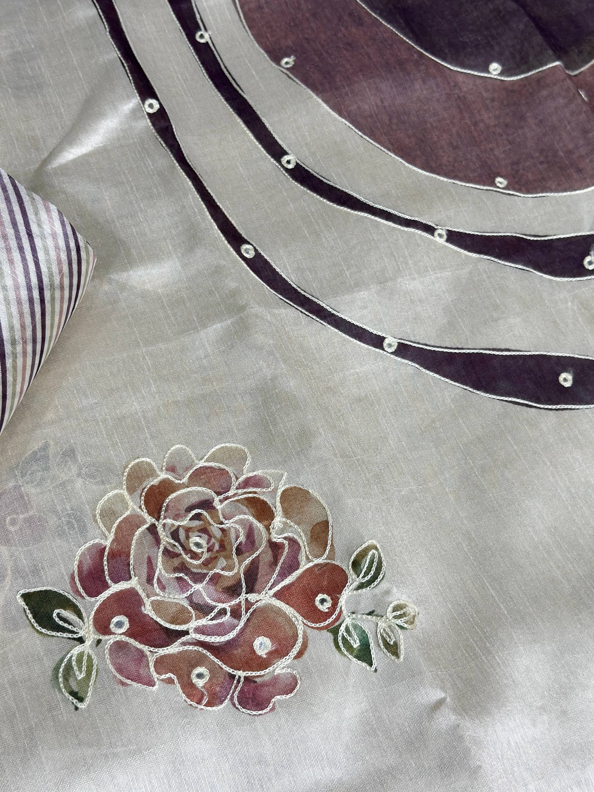 Hand Kantha Work, Mirror & Digital Print Pure Tusser Linen Saree with Blouse