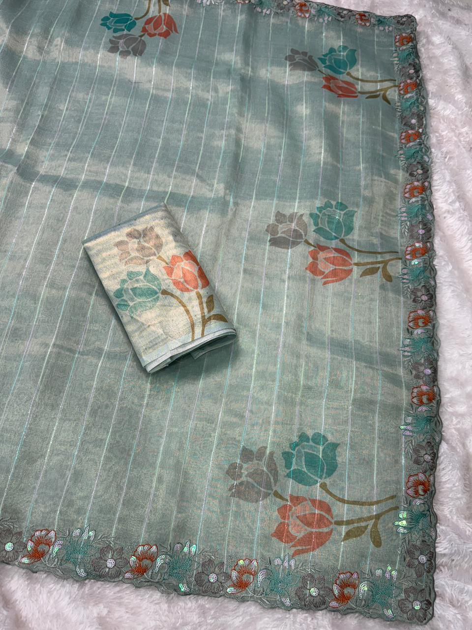 Sequins & Thread Embroidery Work Glass Tissue Organza Saree with Blouse