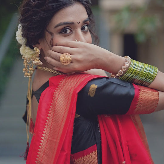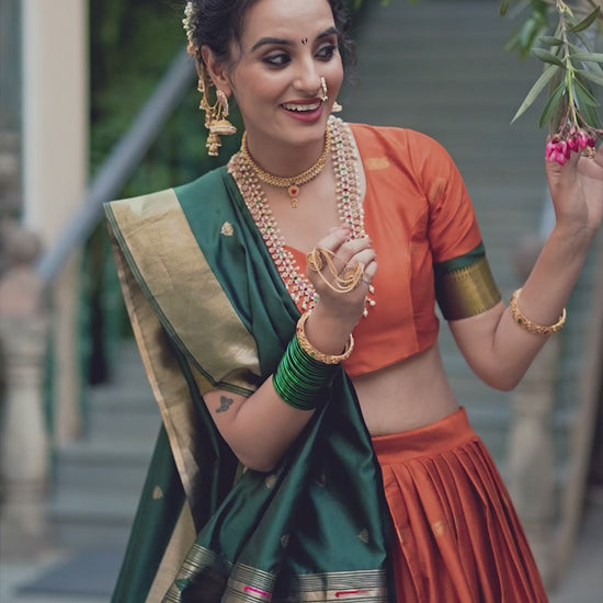 Celebrate tradition with a modern touch — where fiery orange meets royal zari in rich Jacquard silk weaves. This stunning Paithani Lehenga Choli Set blends elegance and heritage, perfect for festive occasions and weddings.