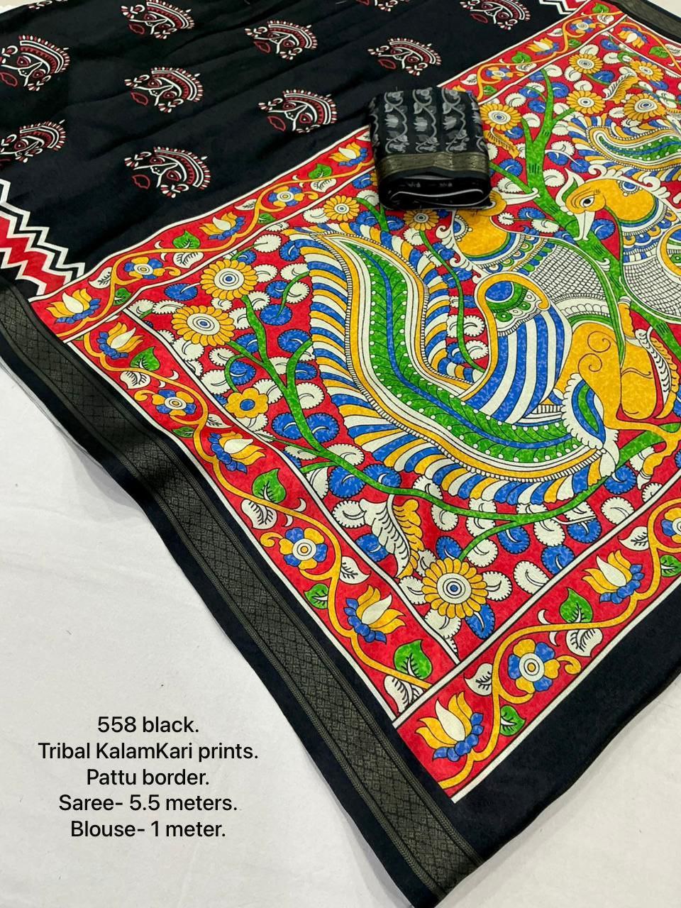 Soft Pashmina Silk with Zari Pattu Border & Jacquard Weave Goddess Kalamkari Black Saree With Blouse