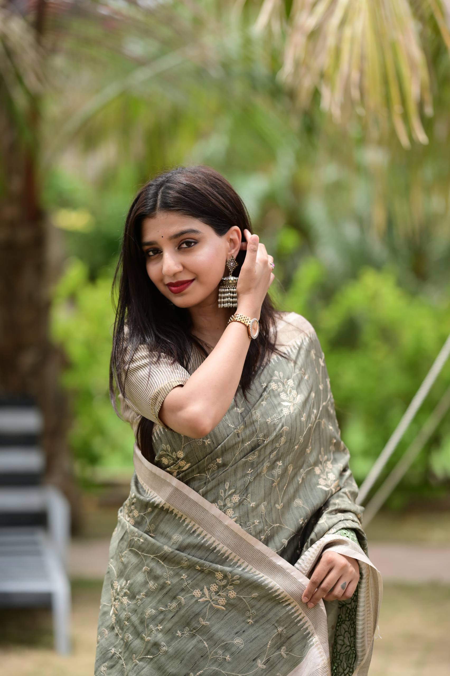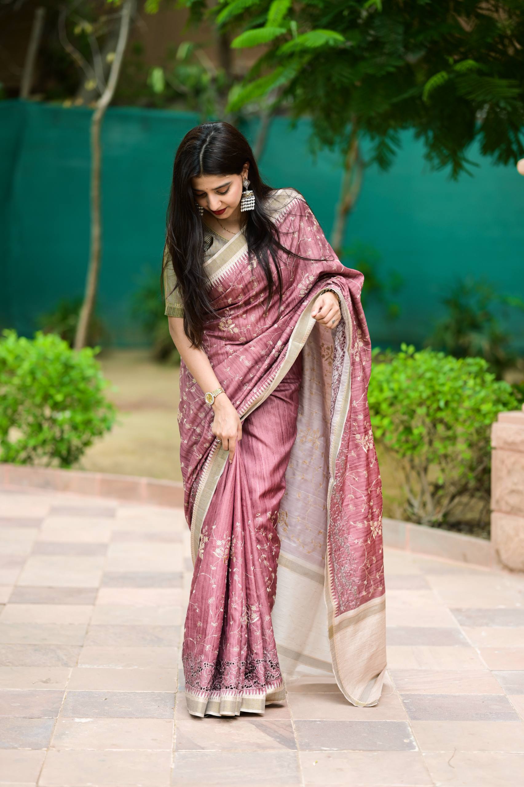 Thread Embroidery Work Zar Weaving Border Digital Printed Tussar Cotton Saree With Blouse
