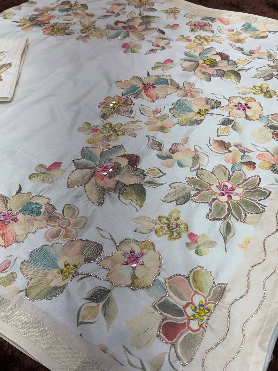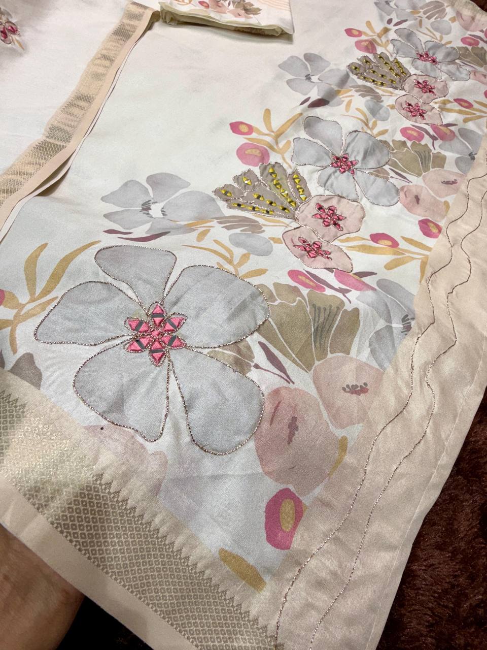 A designer tussar-colored printed beauty for your wardrobe, crafted with intricate hand mirror work for an elegant ethnic touch.
